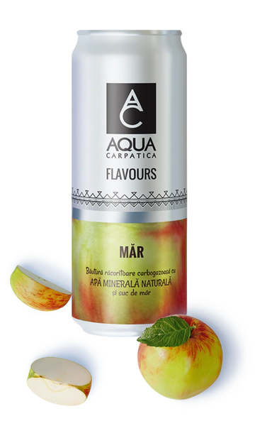 Apă minerală naturală carbogazoasă, aromată cu măr — o simfonie dulce-acrișoară care aduce aminte de prospețimea fructelor culese în toamnele copilăriei.