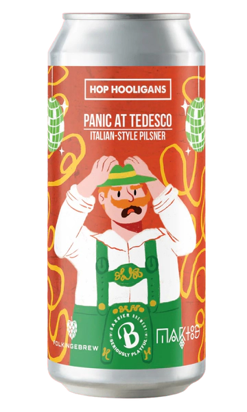 Panic at Tedesco este un Italian-Style Pilsner colaborativ (Hop Hooligans, Baxbier, Folkingebrew, Maktoob), cu 5% ABV, fermentat lager pentru un profil curat si foarte usor de baut. Maltul Eraclea aduce o baza crocanta de cereale, iar hameiul Perle si Saphir construieste note floral-herbale, citrice si un final sec, elegant, cu amareala moderata.